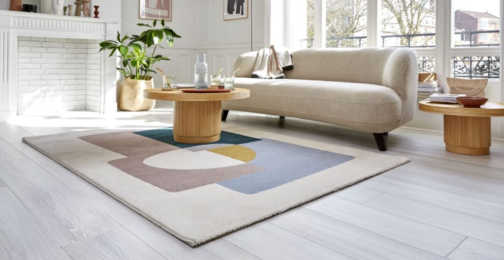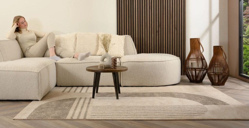 Principe fondamental : les pieds avant du canapé et des fauteuils doivent reposer sur le tapis. Cette configuration crée une unité visuelle et structure l’espace de réception.